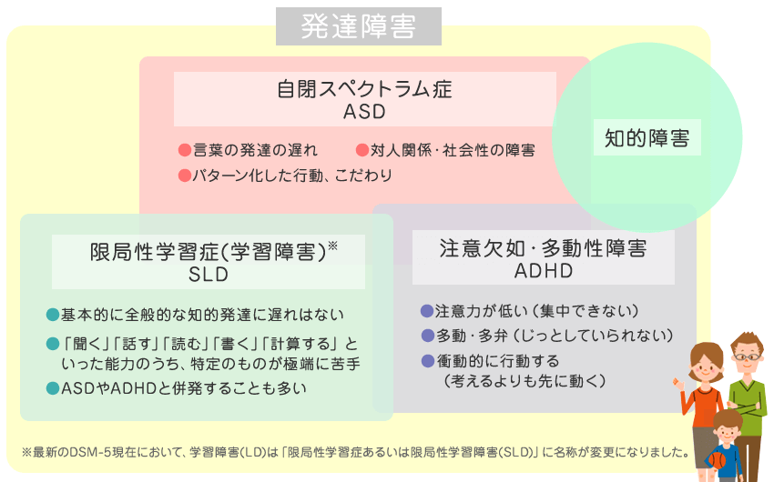 ※最新のDSM-5において、LD(学習障害)は「限局性学習症あるいは限局性学習障害(Specific Leaning Disorder)」に名称が変更になりました。